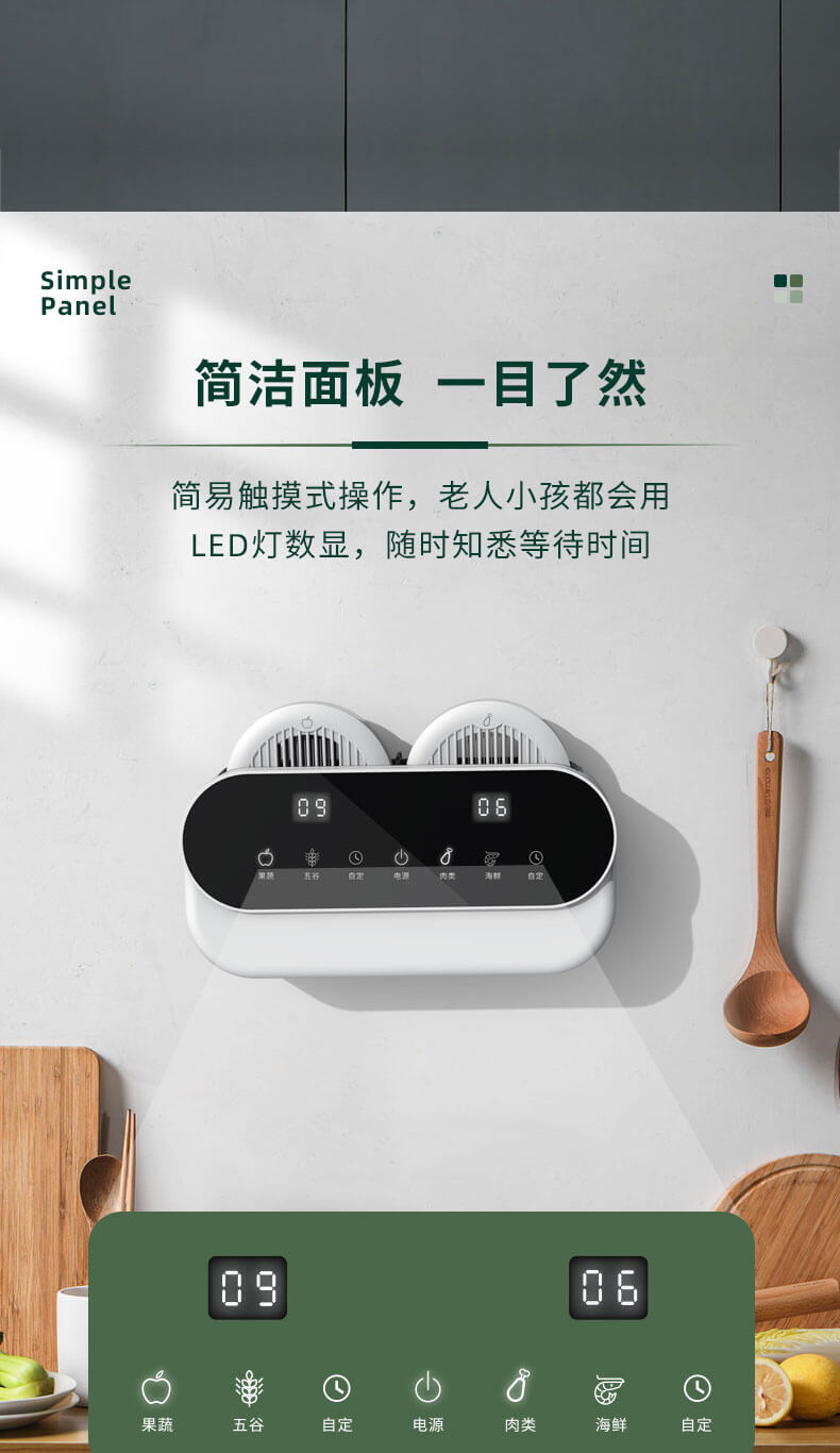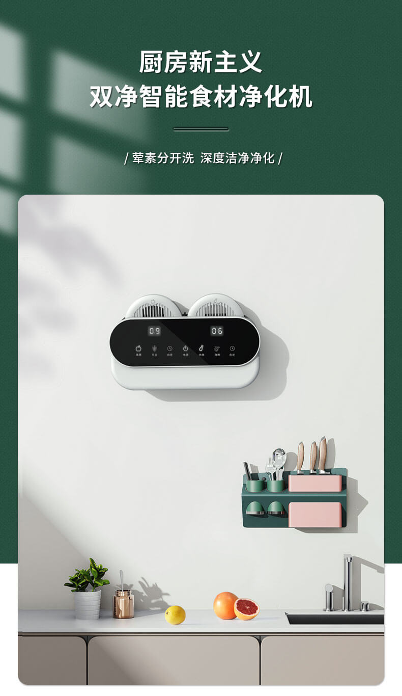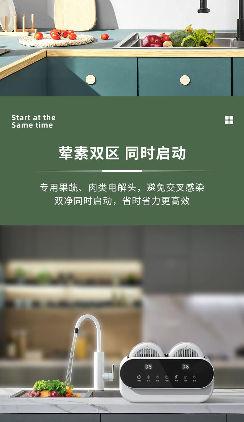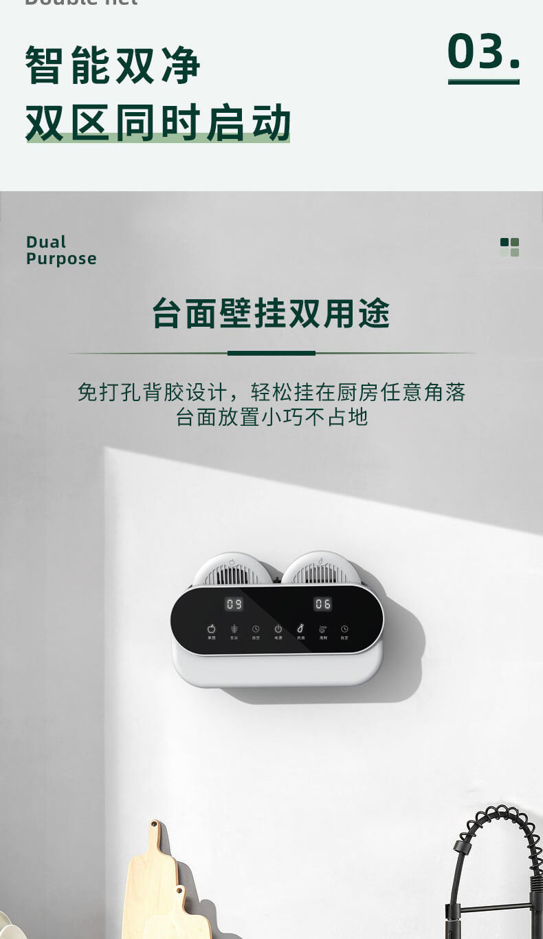 臺面壁掛雙用途,免打孔背膠設(shè)計,輕松掛在廚房任意角落,臺面放置小巧不占地方,STY23A雙倉設(shè)計,葷素雙凈同時啟動,專用果蔬、肉類點解發(fā)生器,避免交叉感染,雙凈同時啟動,省時更高效.