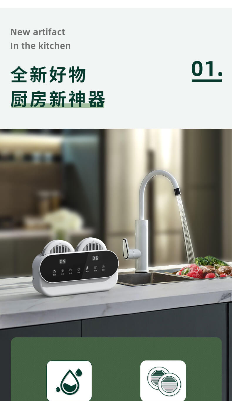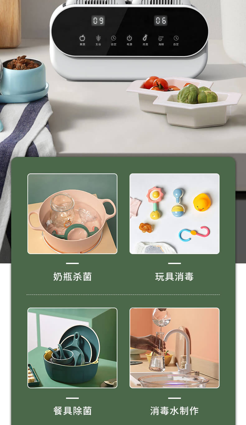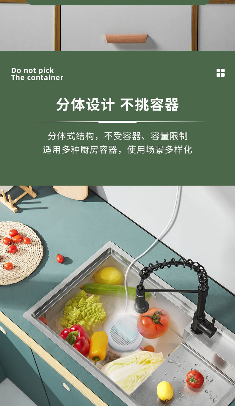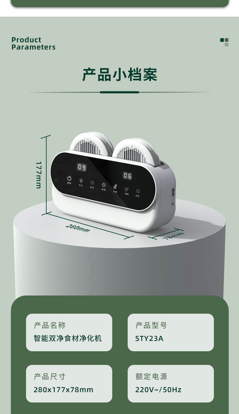 臺面壁掛雙用途,免打孔背膠設(shè)計,輕松掛在廚房任意角落,臺面放置小巧不占地方,STY23A雙倉設(shè)計,葷素雙凈同時啟動,專用果蔬、肉類點解發(fā)生器,避免交叉感染,雙凈同時啟動,省時更高效.