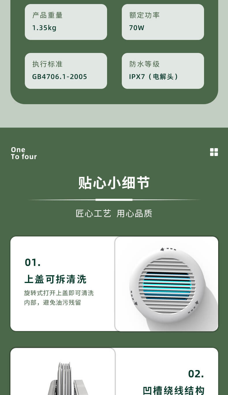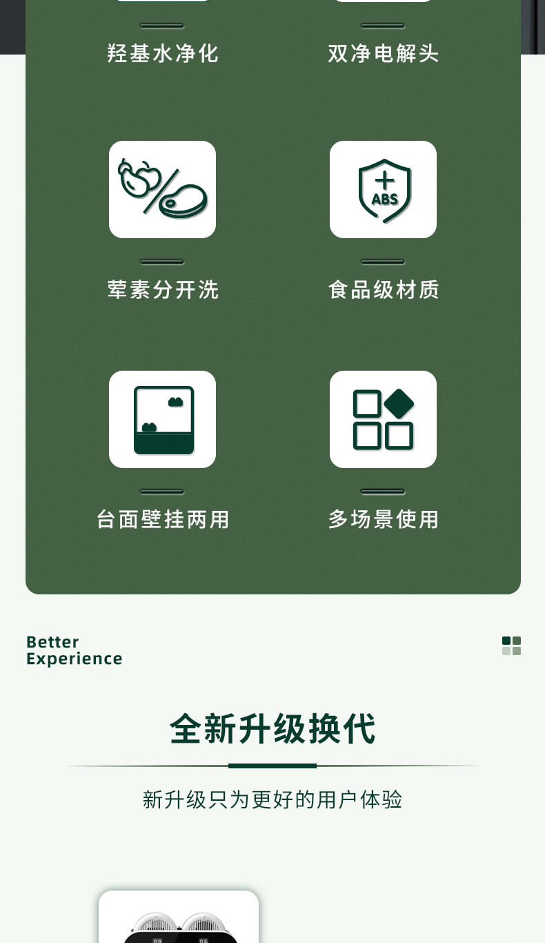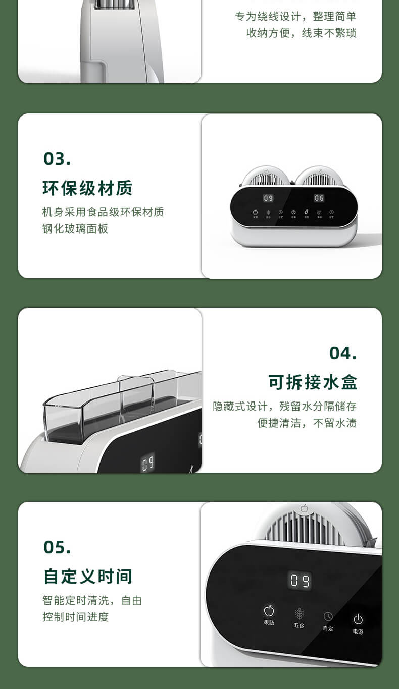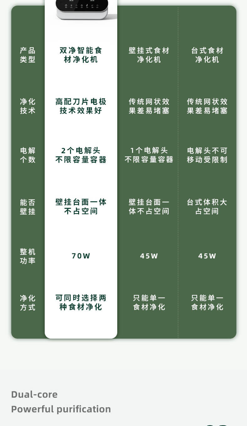 臺面壁掛雙用途,免打孔背膠設(shè)計,輕松掛在廚房任意角落,臺面放置小巧不占地方,STY23A雙倉設(shè)計,葷素雙凈同時啟動,專用果蔬、肉類點解發(fā)生器,避免交叉感染,雙凈同時啟動,省時更高效.